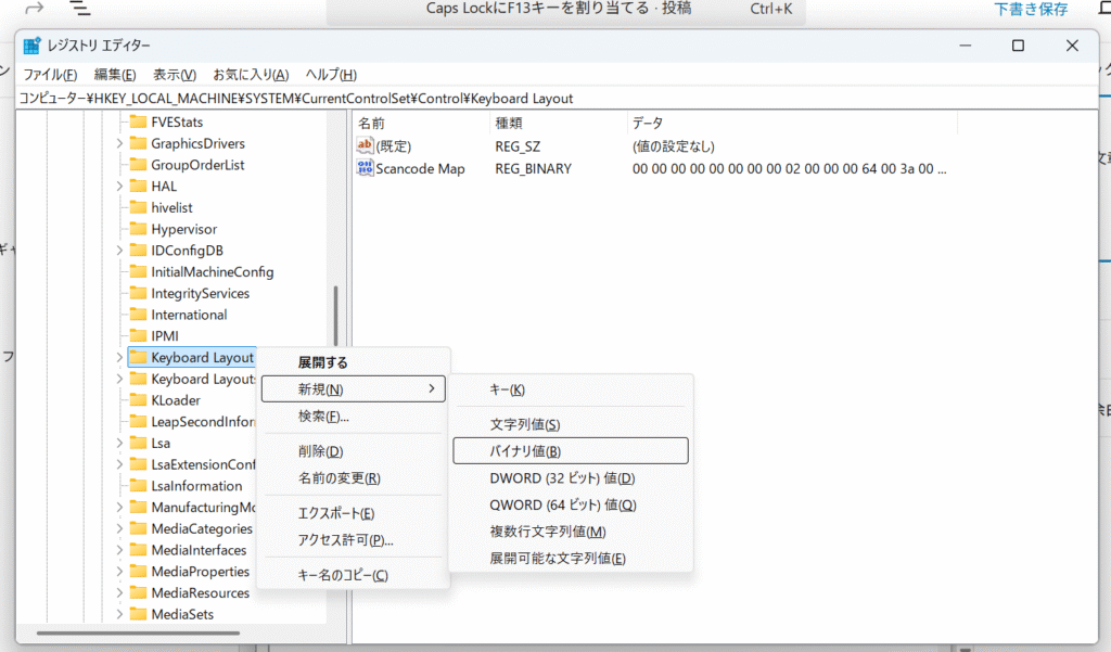 ツリーの「Keyboard Layout」で右クリック→「新規」→「バイナリ値」を選択します。