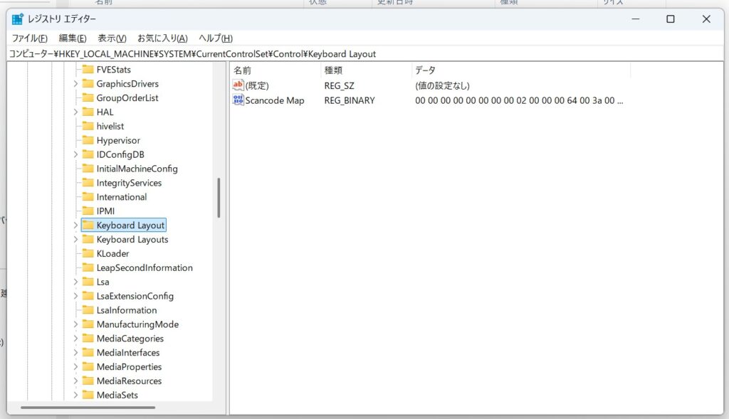 レジストリエディタのツリーを以下の順番で展開し、「Keyboard Layout」を選択します。