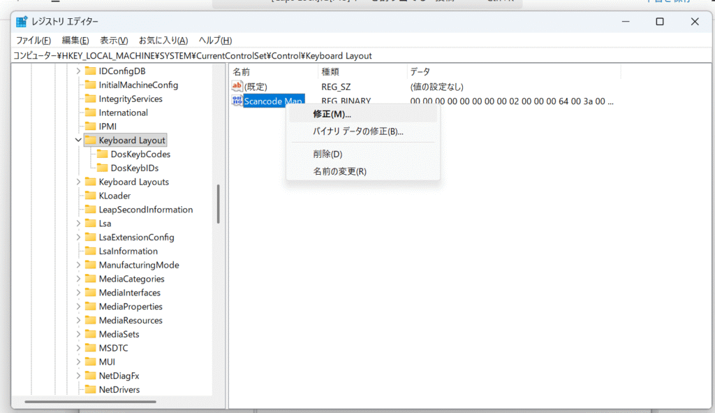 写真3:「Scancode Map」で右クリック→「修正」を選択