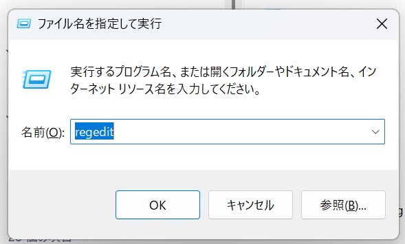 [Windows] + [R]を押し、「regedit」と入力して、「OK」をクリックします。