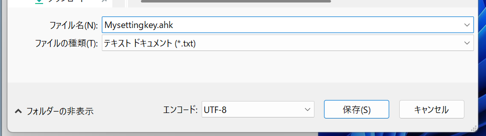 メモを「Mysettingkey.ahk」という名前でデスクトップに保存します。(拡張子は「.ahk」)