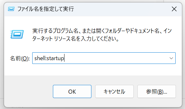 「名前(O):」に「shell:startup」と入力し、「OK」をクリックします。